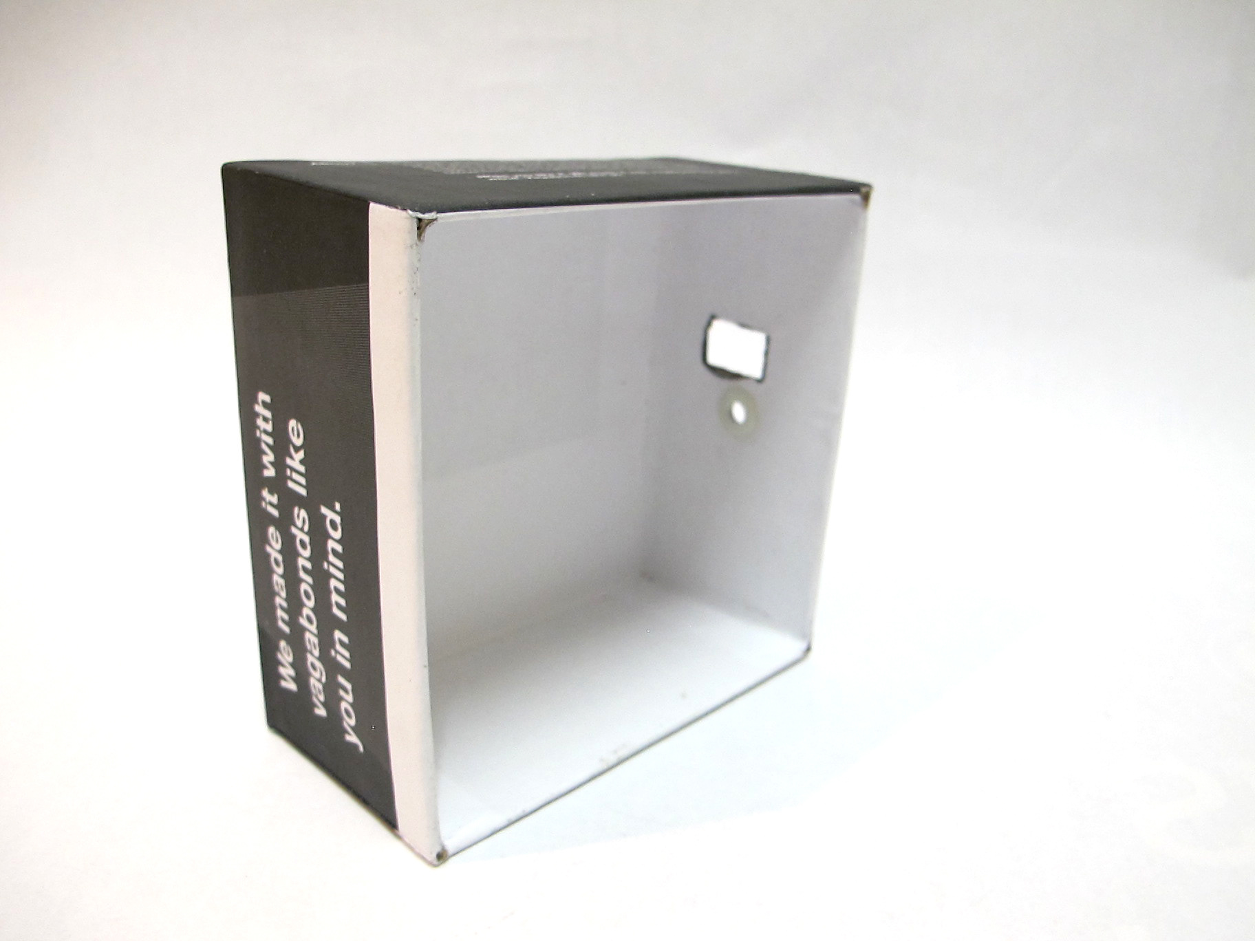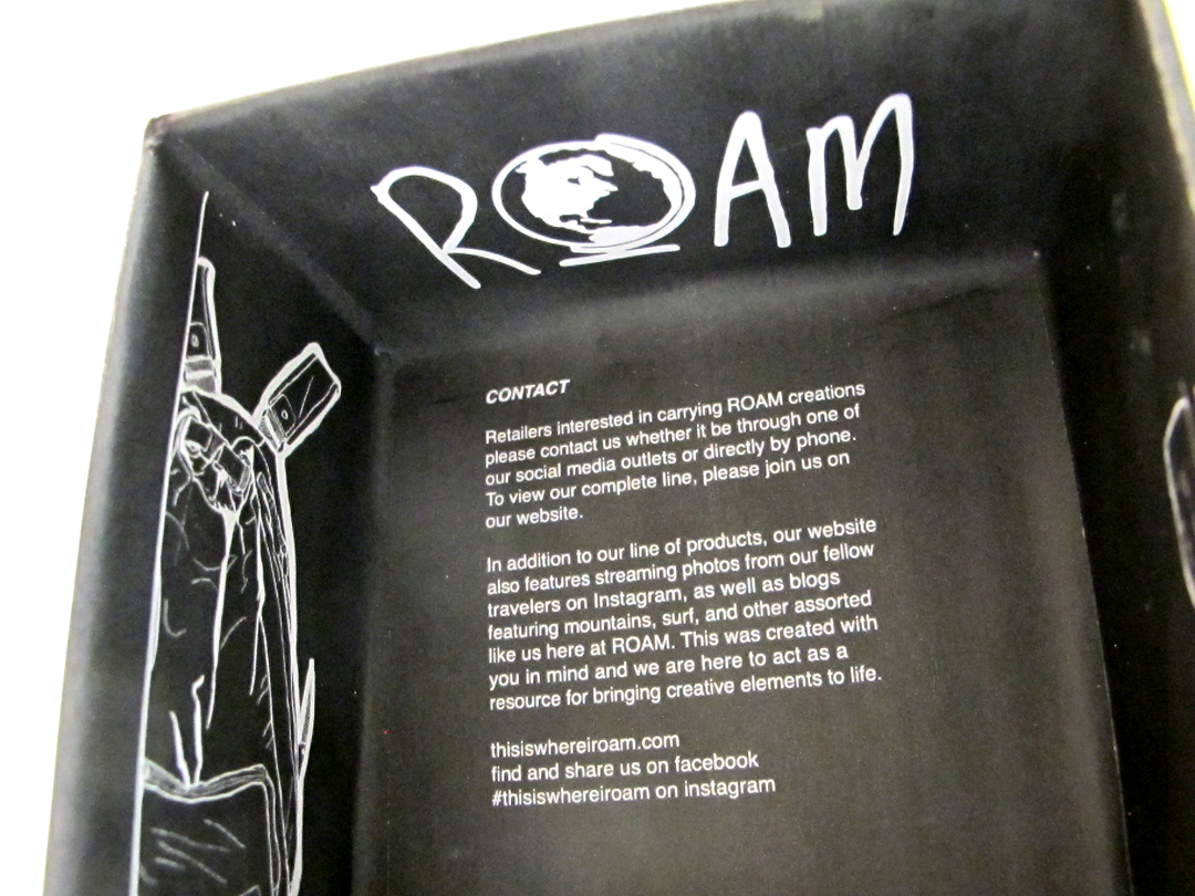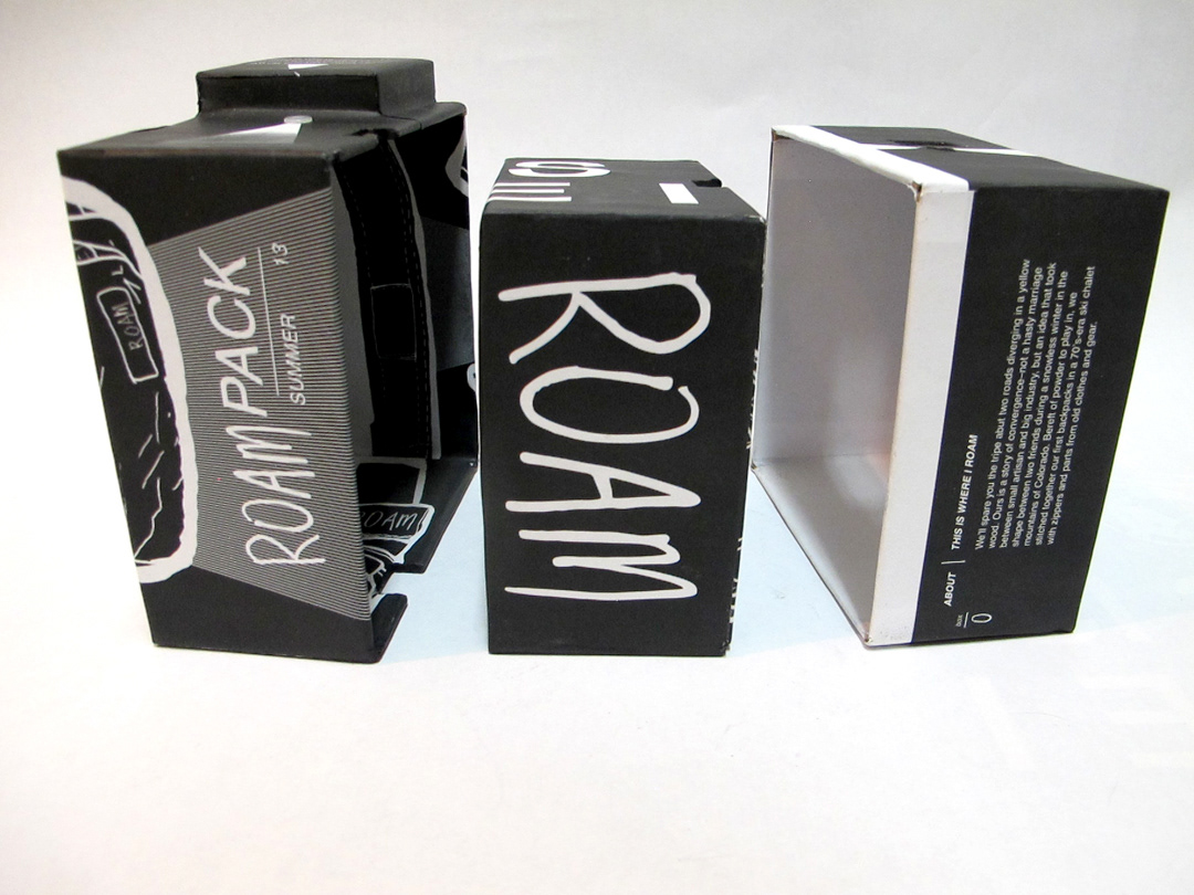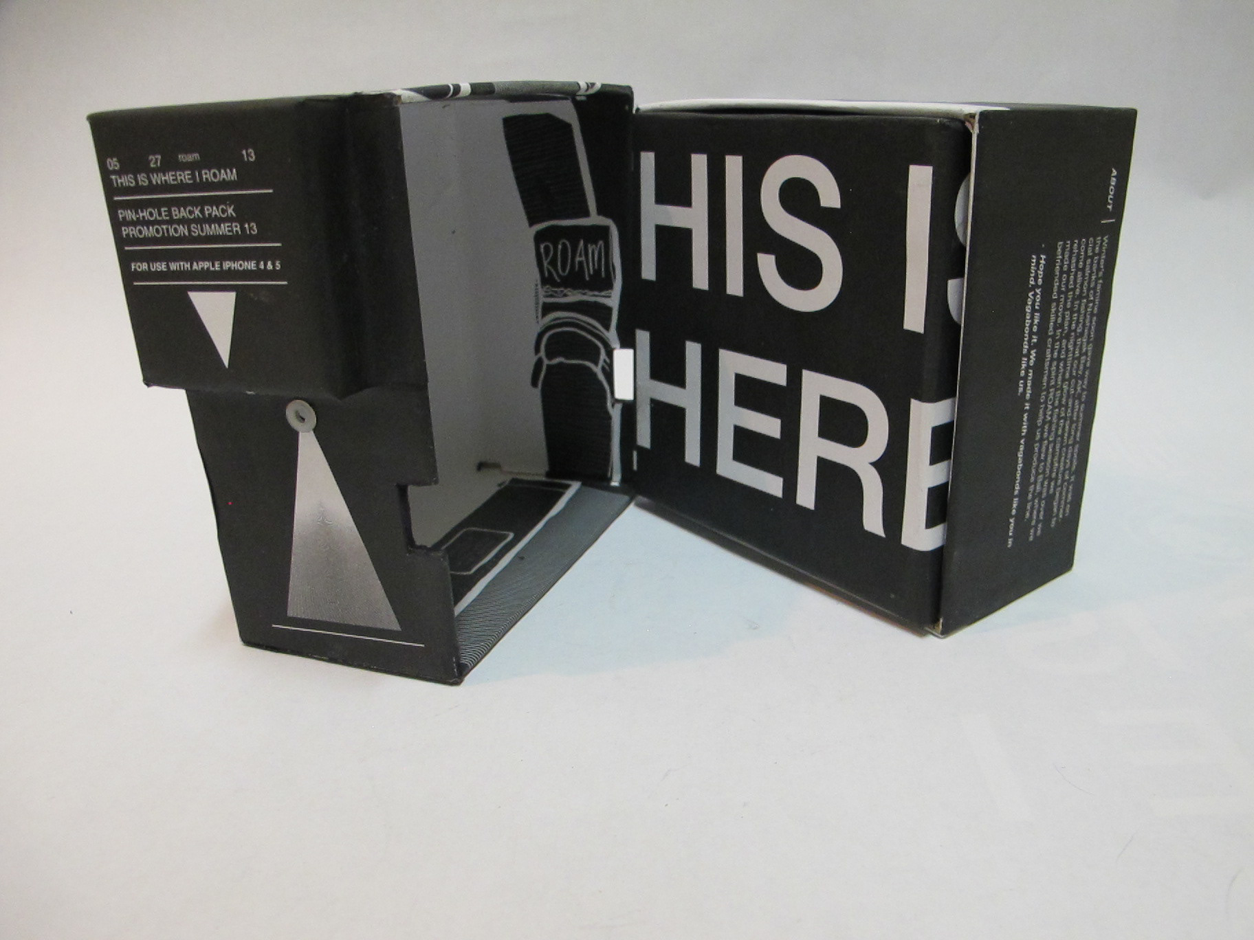 OBJECTIVE For this project, you will develop a design construct of your choosing. In the case of this project, however, the medium, the tenor, and the specific subject matter should serve to benefit the organization for which you are designing. INTENTIONS ROAM promotional packaging focuses on their backpack lines. The packaging also acts as a functional pin-hole camera for iPhones (3, 4, 4s, or 5). The driving force of the concept comes from within the company name being ROAM and their current marketing scheme of using Instagram and photography to document one’s travels. The target audience is fairly broad when it comes to who would purchase a backpack.
